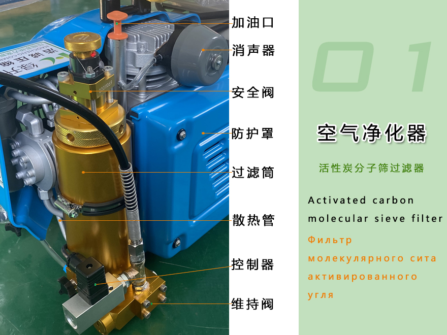 集成过滤净化:包含进气空气过滤器、油水分离器(标配手动排污)以及由活性炭、分子筛和一氧化碳催化层构成的三重呼吸空气净化器。